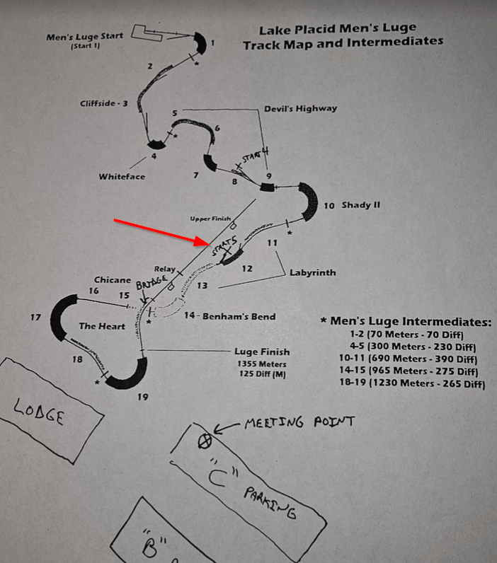 Each kid got to do two runs on the first day. They started at Start #5, which is the lowest starting point. We asked the coaches how fast they were going and the coaches estimated around 40-45 MPH! When they start from the very top, the Luge athletes reach speeds over 90MPH! Here is a pic of the coarse map.